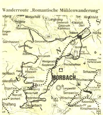 Am 22.09.99 war es endlich soweit, unsere "Romantische Mühlenwanderung", die von der Gemeinde Morbach im Hunsrück organisiert worden war, konnte beginnen. Wie geplant, starteten wir um 9:00 Uhr in Richtung Autobahn. Wir fuhren über die A5 zum Nordwestkreuz Frankfurt und dann über die A66 bis zum Schiersteiner Kreuz. Danach über die A60 und A61 bis zur Abfahrt Rheinböllen und dann noch auf der B50/ B327 bis nach Wenigenrath bei Morbach.