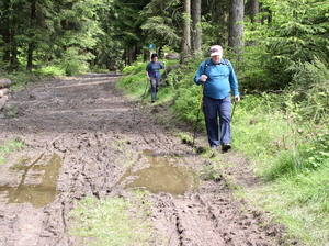 Die Wanderwege waren gut zu gehen, aber auch sowas wie hier dieser Schlammweg war vorhanden. Ich verstehe schon, dass die Holzabfuhr diese Wege benötigt und bei Regenwetter sieht das dann halt so aus, aber ein markierter Umweg wäre hier schon notwendig gewesen. Korrekterweise muss ich aber hier anführen, dass wir später eine solche Umleitungen benutzt haben.